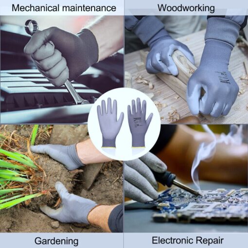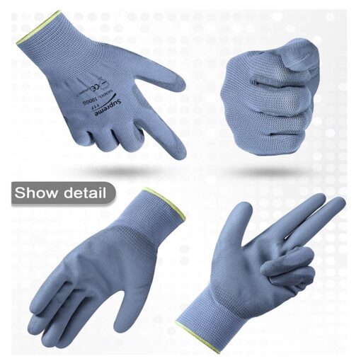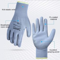 This is a grey nylon or polyester knitted liner glove with a grey polyurethane (PU) coating on the palm and on the finger tips. The back of the gloves remain uncoated providing good ventilation to the hand avoiding perspiration and clamminess. This glove is like a second skin, molds to operator’s hand and is very popular among automobile industry, while also used at delicate engineering operations. Very comfortable with high level of flexibility